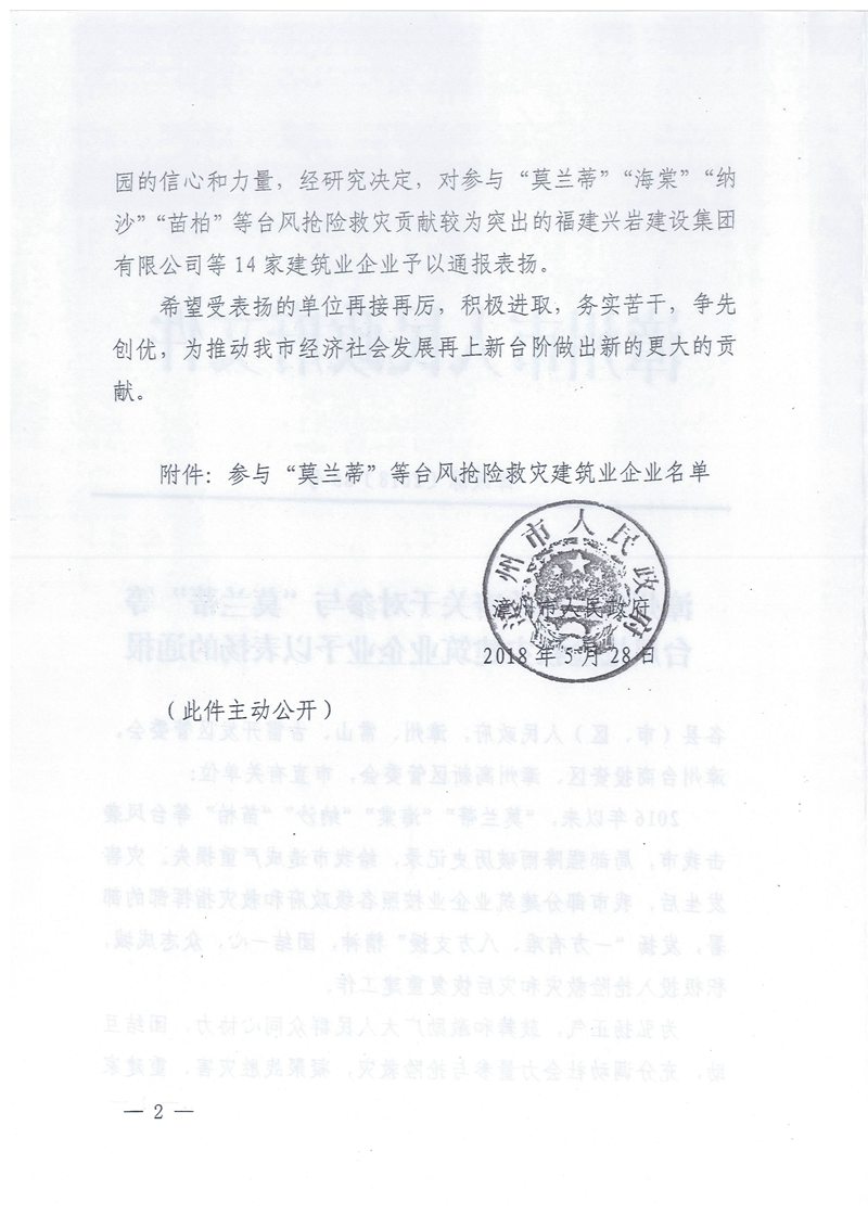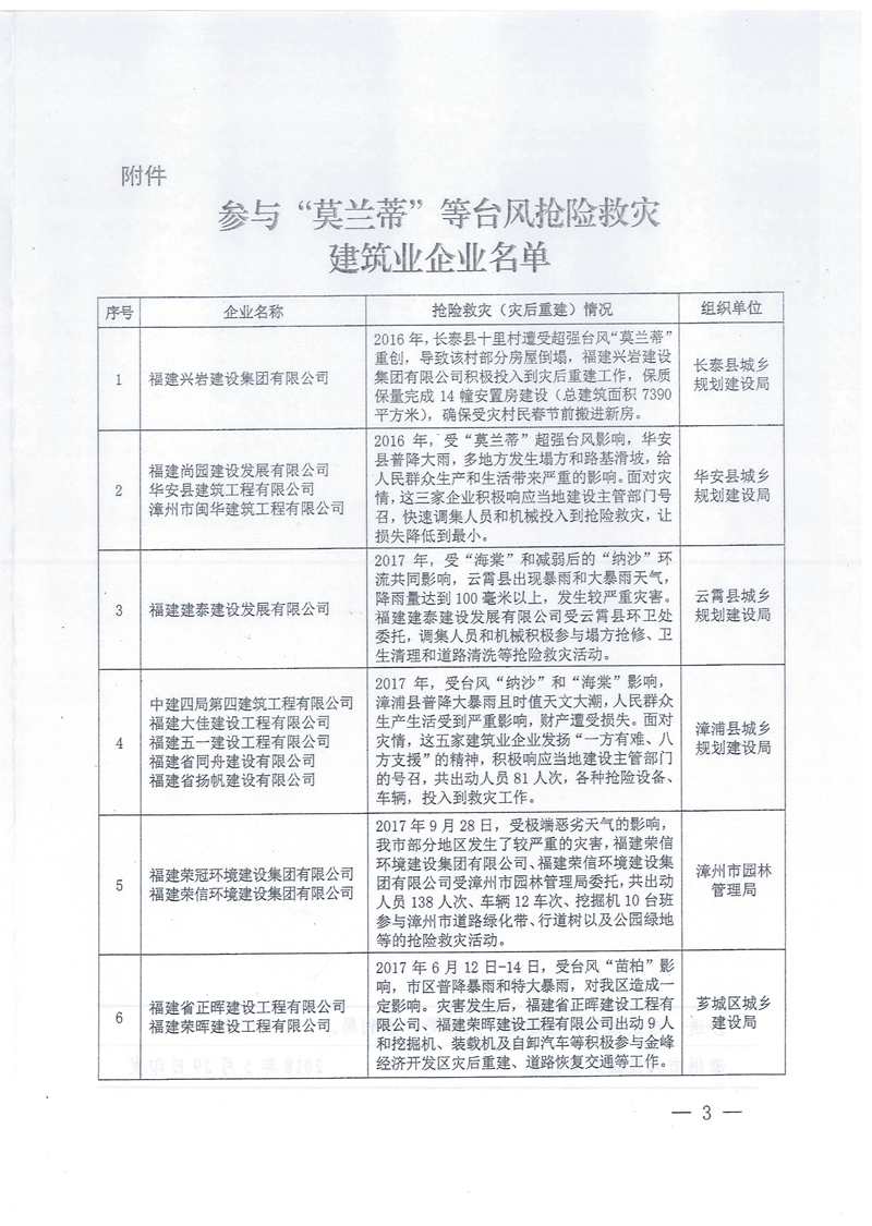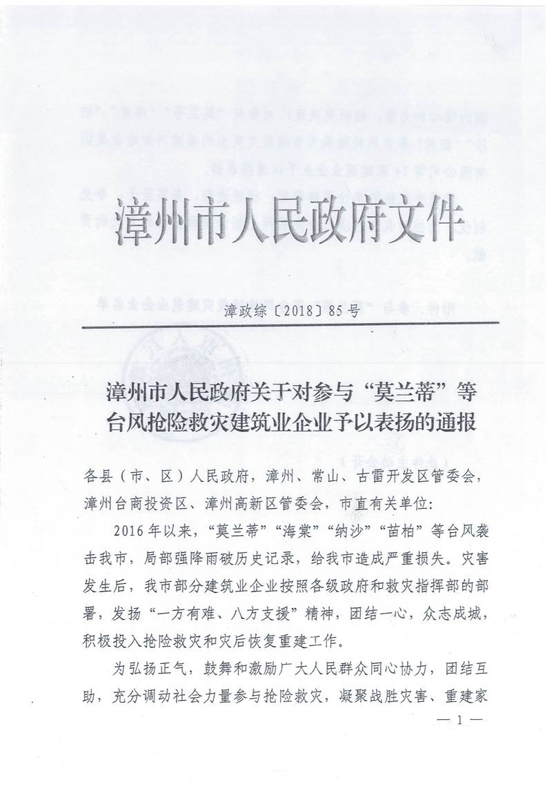 近日,漳州市人民政府發(fā)文,對參與 “莫蘭蒂”等臺風搶險救災(zāi)建筑企業(yè)予以通報表揚,我集團在搶險救災(zāi)中貢獻較為突出名列其中,為集團在信用評價體系獲得了加分機會,這是我集團贏得的一項新榮譽。