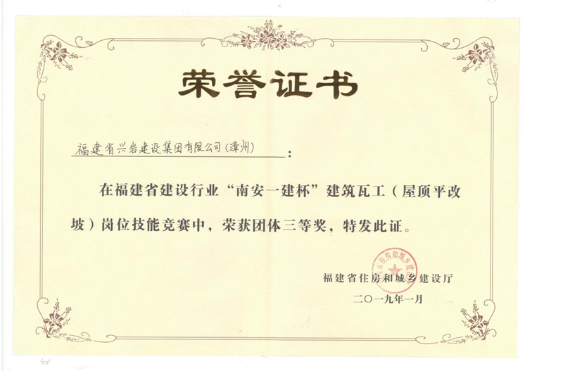 2019年1月23日,為期12天的福建省建設行業建筑瓦工(屋頂平改坡)崗位技能競賽在南安閉幕。我集團代表隊經過賽前賽后精心設計和籌劃,在全省31個企業團隊中脫穎而出,喜獲團體三等獎。