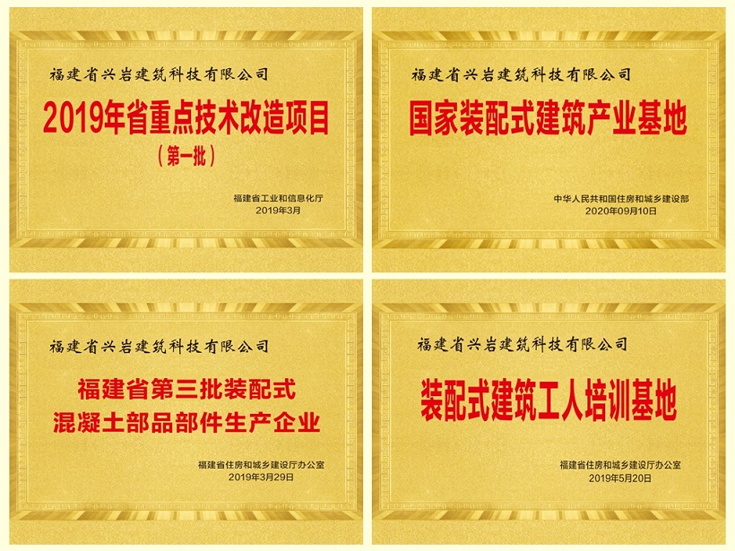 公司截止到目前已獲得“第二批國家裝配式建筑產業基地”、“福建省第三批裝配式混凝土部品部件生產基地”、“福建省裝配式建筑工人培訓基地”、“2019年福建省第一批重點技術改造項目”等多項裝配式相關的技術專利。