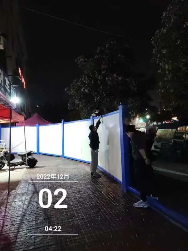 接到電話后,集團(tuán)管理層第一時(shí)間反應(yīng),全公司立即啟動(dòng)一級(jí)應(yīng)急響應(yīng)模式。利用電話、微信等平臺(tái)統(tǒng)籌工作部署,聯(lián)系工廠負(fù)責(zé)人,到宿舍一間一間敲門叫醒正在熟睡的工人。集團(tuán)總工、供應(yīng)部總監(jiān)、行政負(fù)責(zé)人等全體出動(dòng),帶著10多位工人和提前協(xié)調(diào)從多處調(diào)來用作準(zhǔn)備的500米擋板物資,頂著狂風(fēng)暴雨迅速趕赴指定現(xiàn)場(chǎng),開展防疫封控工作,爭(zhēng)分奪秒地筑起一道道隔開病毒與民眾的“安全墻”,積極配合區(qū)政法委緊急處理疫情封控工作。
