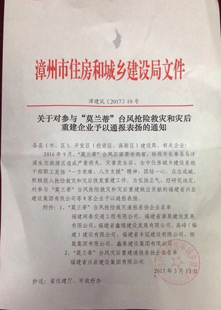 日前,漳州市住房和城鄉(xiāng)建設(shè)局對(duì)參與“莫蘭蒂”臺(tái)風(fēng)搶險(xiǎn)救災(zāi)和災(zāi)后重建做出貢獻(xiàn)的福建省興巖建設(shè)集團(tuán)有限公司等8家企業(yè)予以通報(bào)表?yè)P(yáng)。!